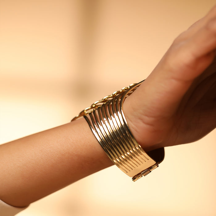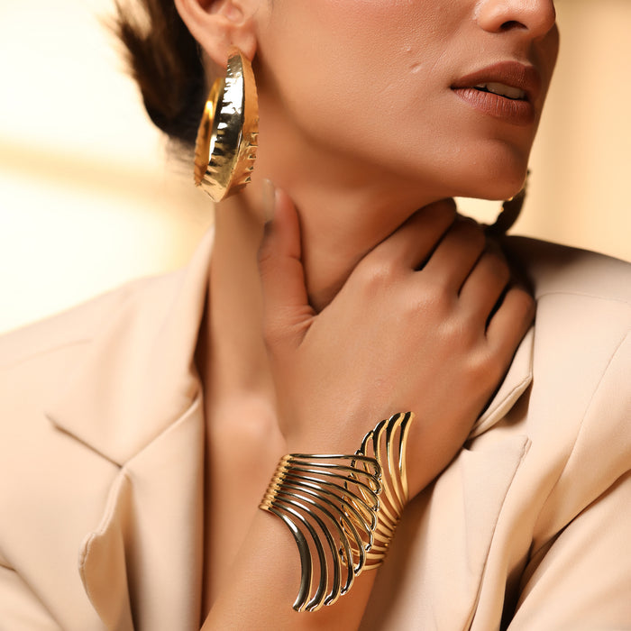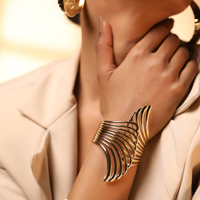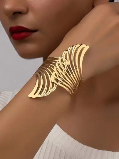 Experience the divine with our RAIRA Angel Wings Designer Bracelet! This stunning gold bracelet will make a statement and add a touch of elegance to any outfit. Feel like an angel as you wear this unique piece of jewelry. Perfect for any occasion and sure to inspire awe in those around you.