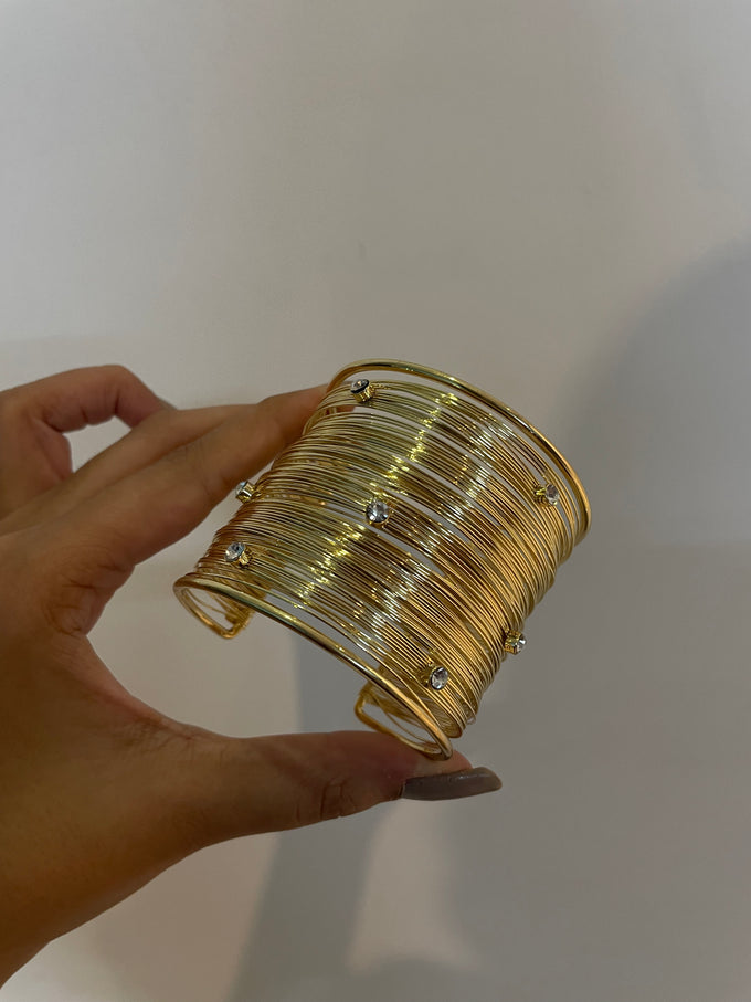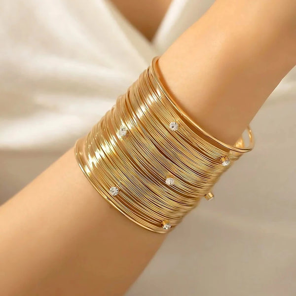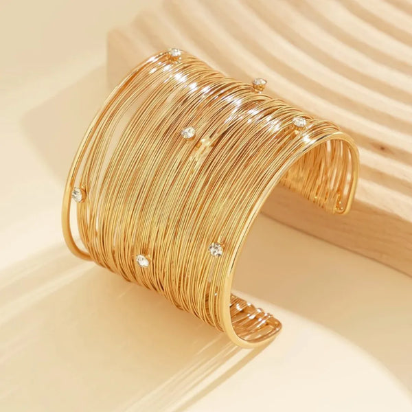 RAIRA Gold Toned Artificial Chunky Wide Bangle Wrist Cuff Layered Bracelet Boho Hollow Adjustable Rhinestone Wrap Cuff Bracelet For Women & Girl's