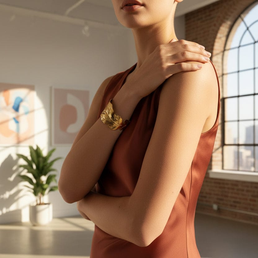 This sexy and versatile RAIRA Golden Leaf Statement Cuff Bracelet is a must-have accessory for daily wear or special occasions. Made of high-quality alloy, it features a unique leaf design that adds a touch of elegance to any outfit. Perfect for all seasons.