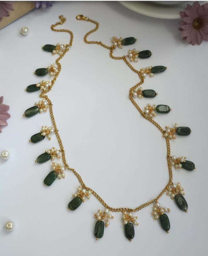 Make a statement with our modern masterpiece, featuring green kundan units expertly strewn together to create a show-stopping contemporary necklace. Highlighted with vibrant jade green stones, this sleek and sophisticated piece boasts a unique blend of traditional craftsmanship and modern style. Perfect for those who crave a fresh take on elegance, this necklace is sure to turn heads