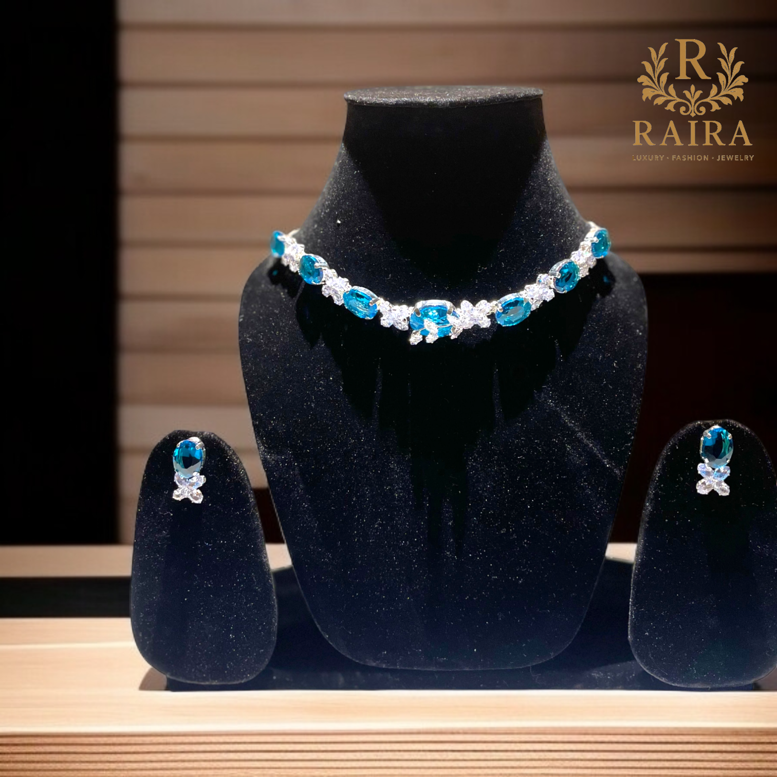 Rhodium-Plated necklace, Blue American Diamond studded details